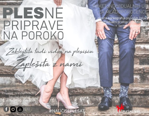 V Plesnem valu smo za vas pripravili poseben program plesnih priprav na poroko na osnovi individualnega plesnega tečaja. Ta zajema paket treh individualnih ur z našim plesnim učiteljem, kjer se vama bomo lahko v celoti posvetili in po vajinih željah pripravili plesno koreografijo, s katero bosta nedvomno očarala vse prisotne, vidva pa bosta svoj plesni program odplesala sproščeno in brez treme. Ker vemo, da imate bodoči mladoporočenci urnik poln obveznosti, se z vsakim parom posebej uskladimo in dogovorimo za želen termin. Za rezervacijo termina nas pokličite na tel.: 041 383 508 (Boštjan).