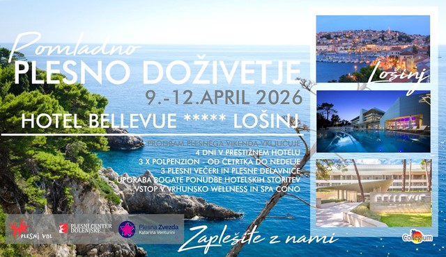 Za vas dragi plesalci in plesalke pa smo to pomlad pripravili še en plesni dogodek. Na enem izmed najlepših hrvaških otokov – Lošinju bo tudi letos potekalo drugo pomladno plesno doživetje, ki ga pripravljamo v Plesnem valu in Plesnem centru Dolenjske. Družili se bomo od četrtka, 9. do nedelje, 12.aprila 2026 v vrhunskem Hotelu BELLEVUE***** na Lošinju.